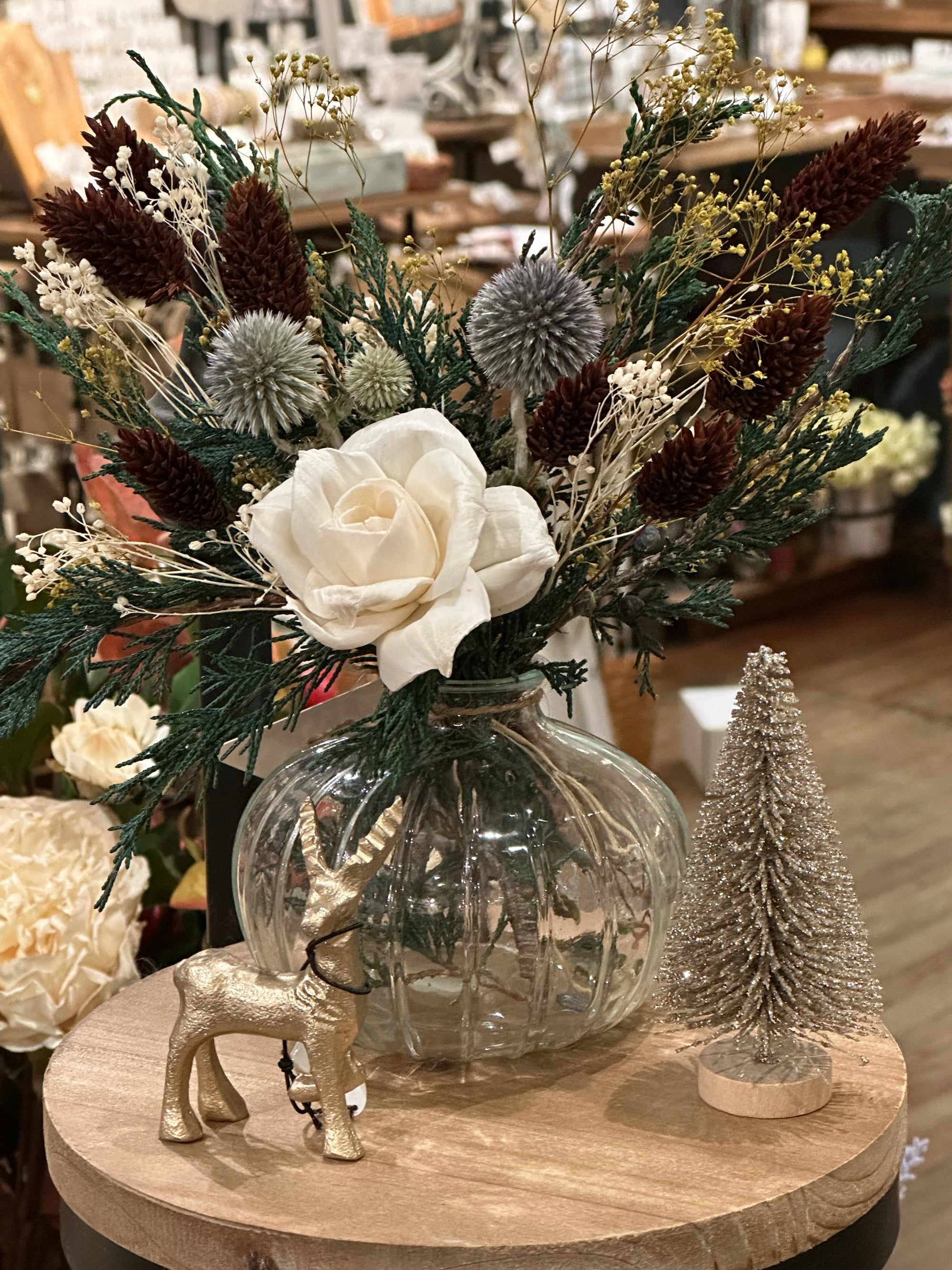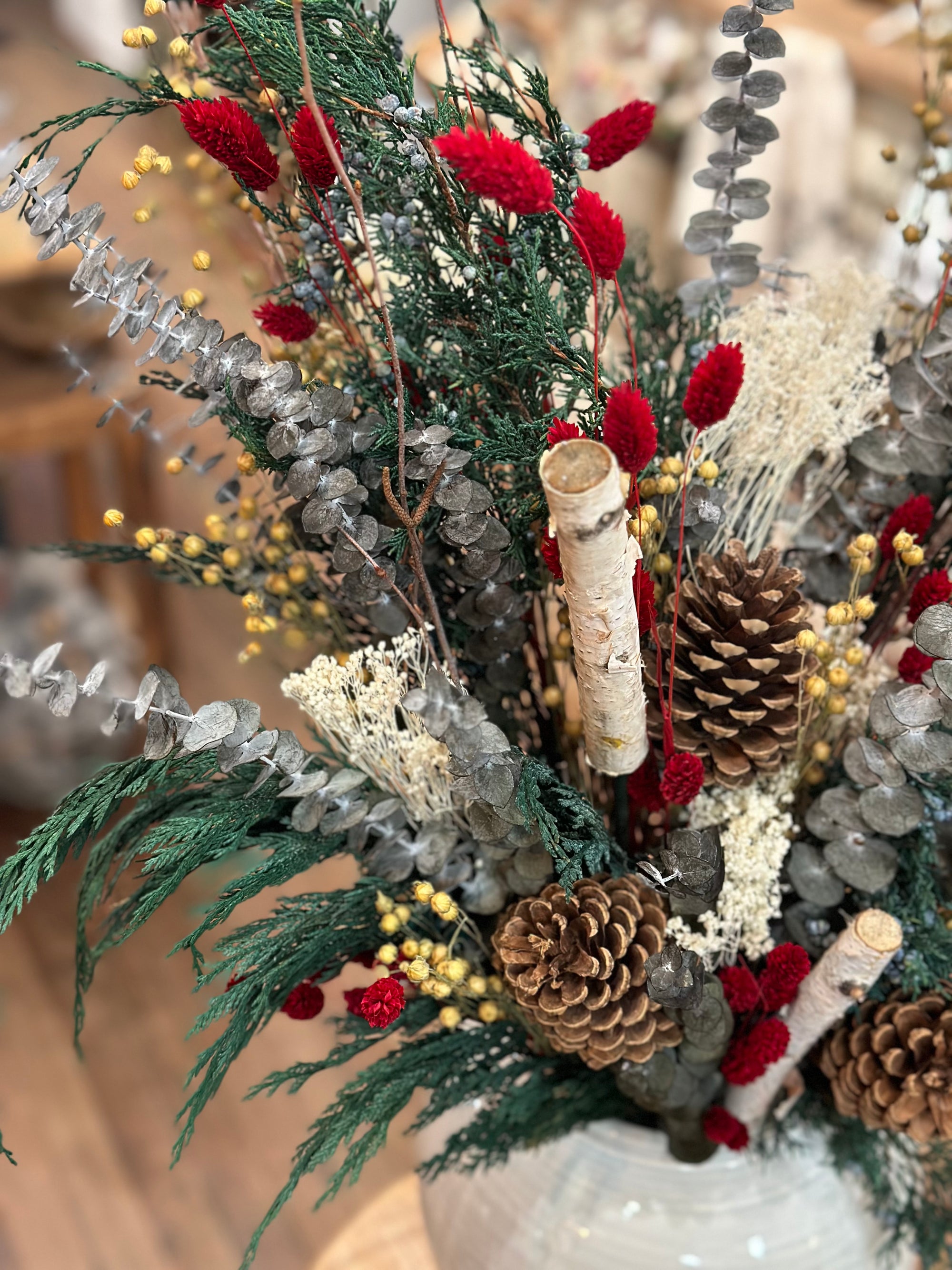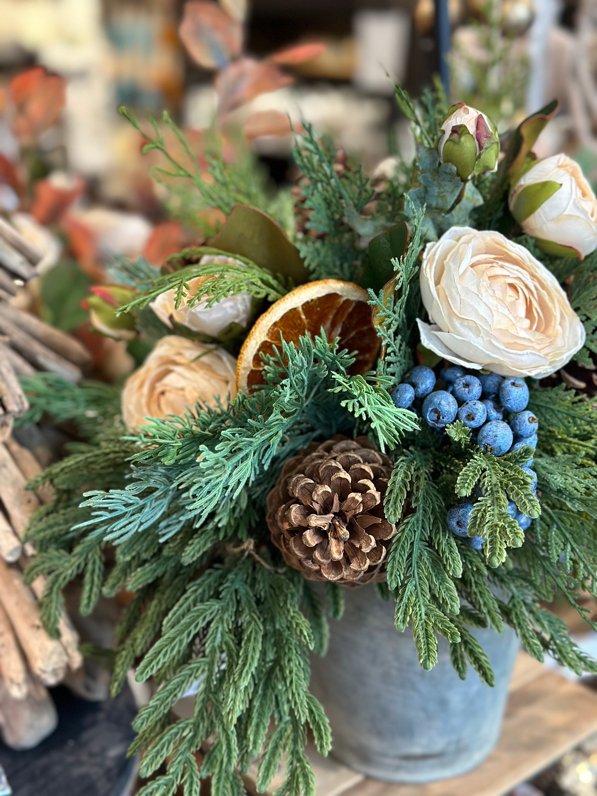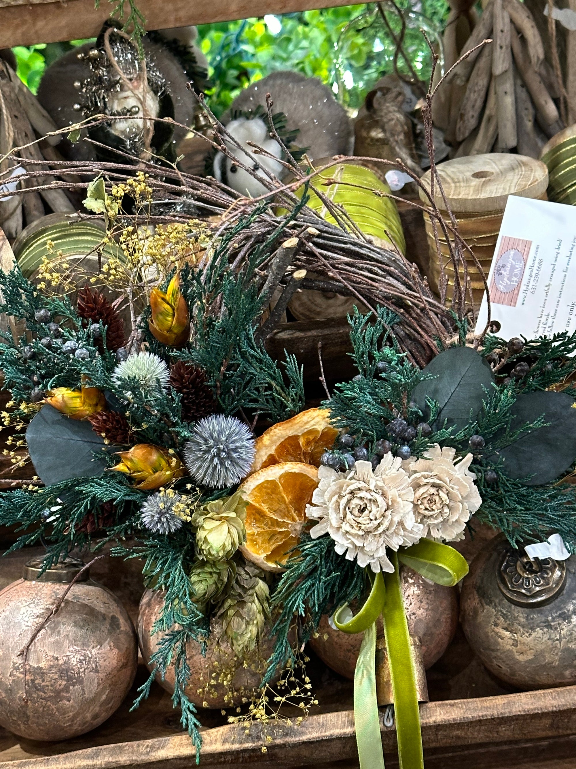 We are busy creating everlasting wreaths and arrangements. Winter greens, dried flowers, realistic faux, pinecones and seed pods. Our collection moves quickly, please visit us in store for best selection.