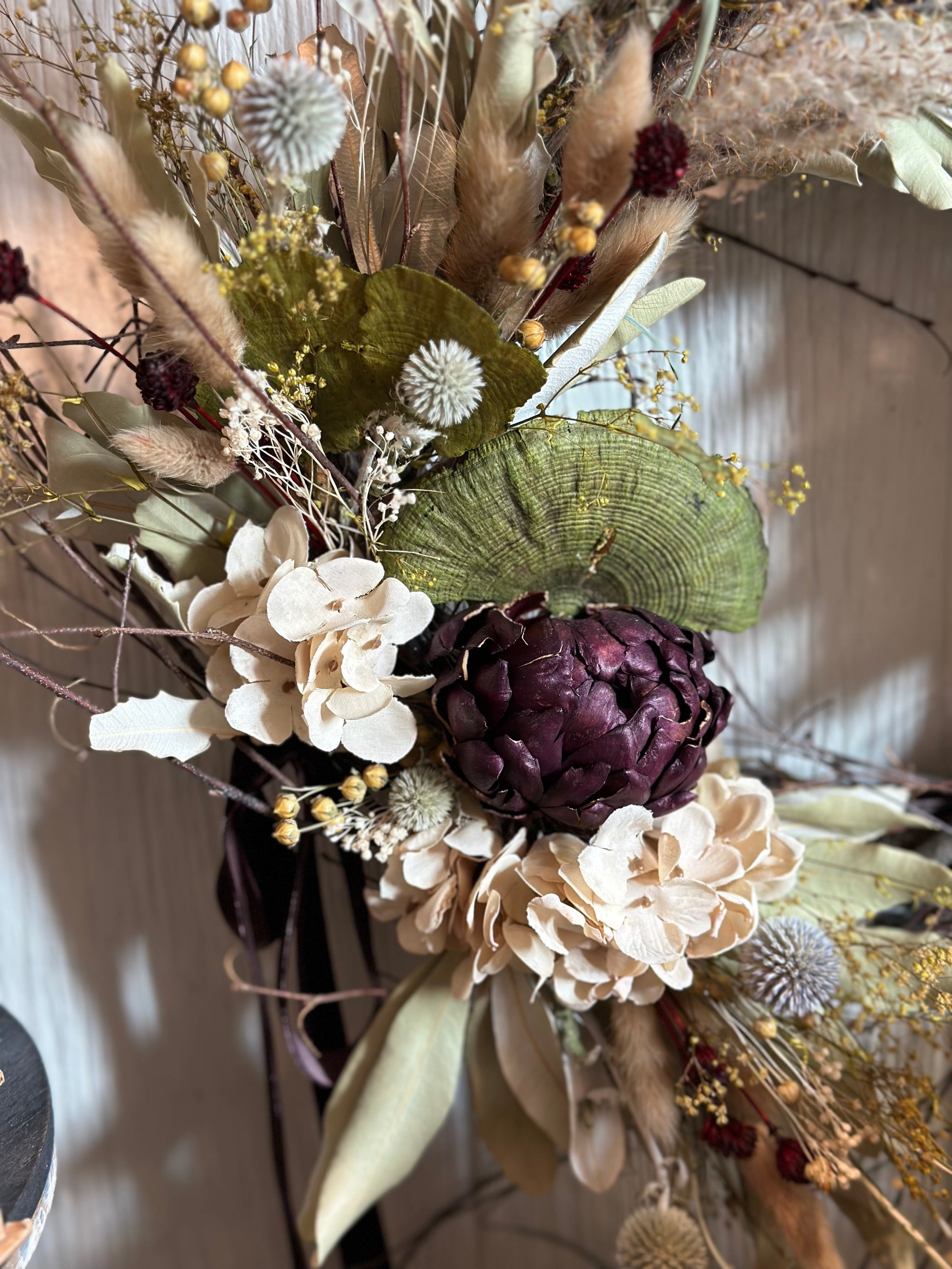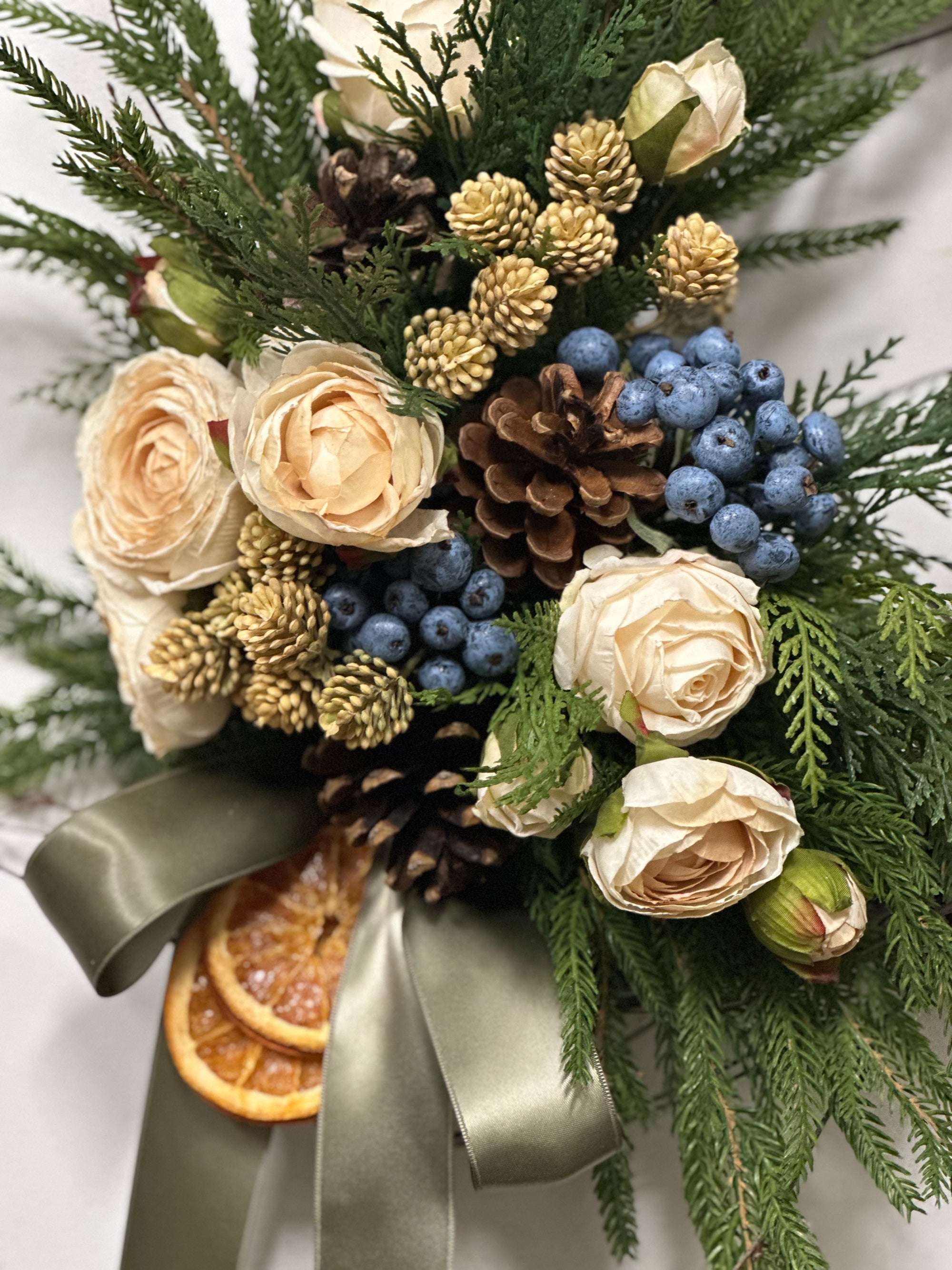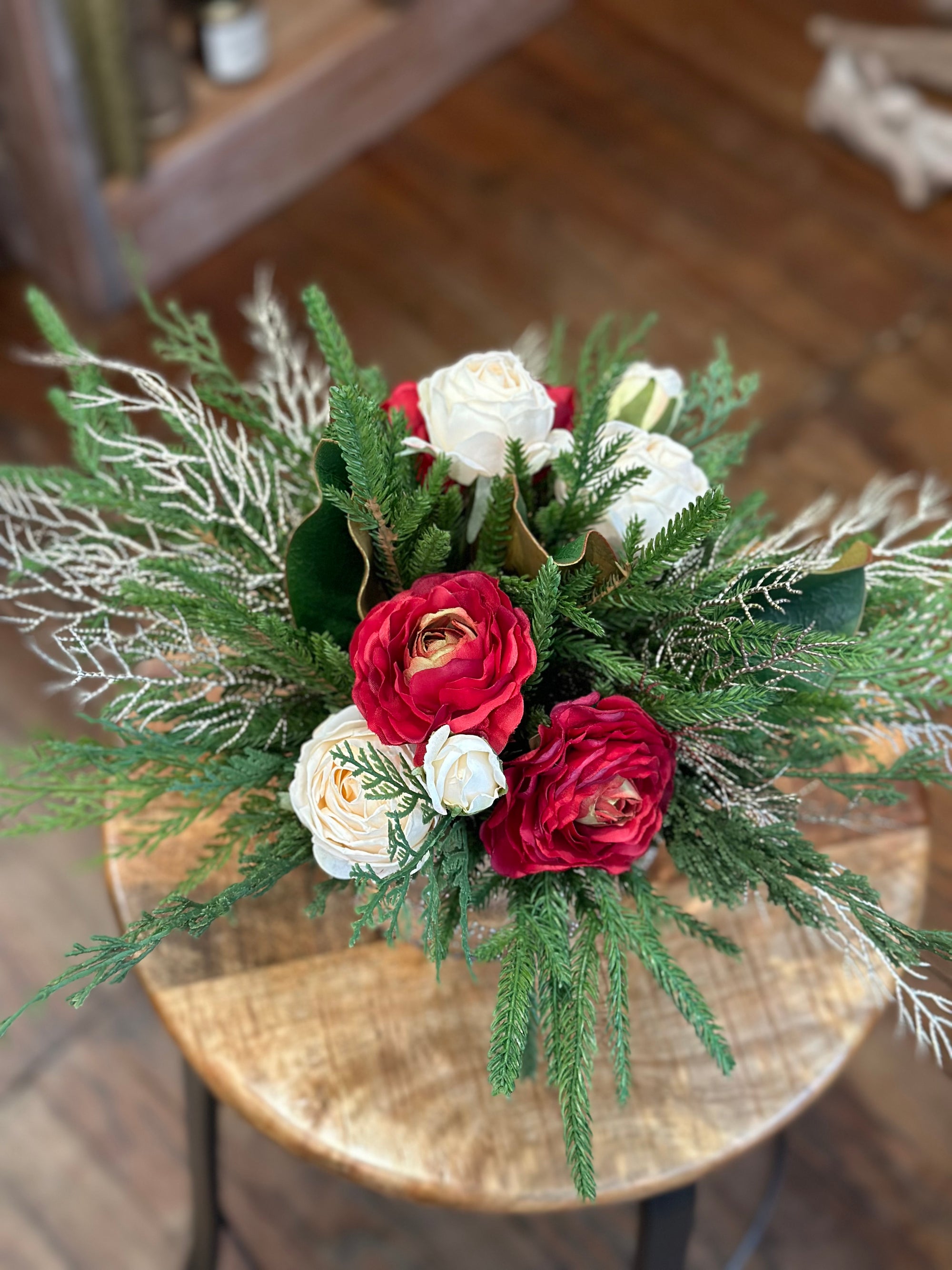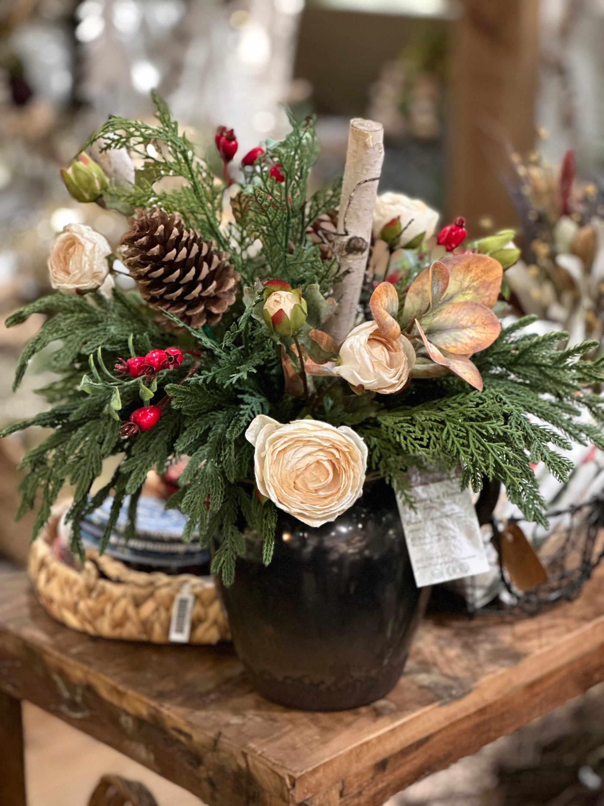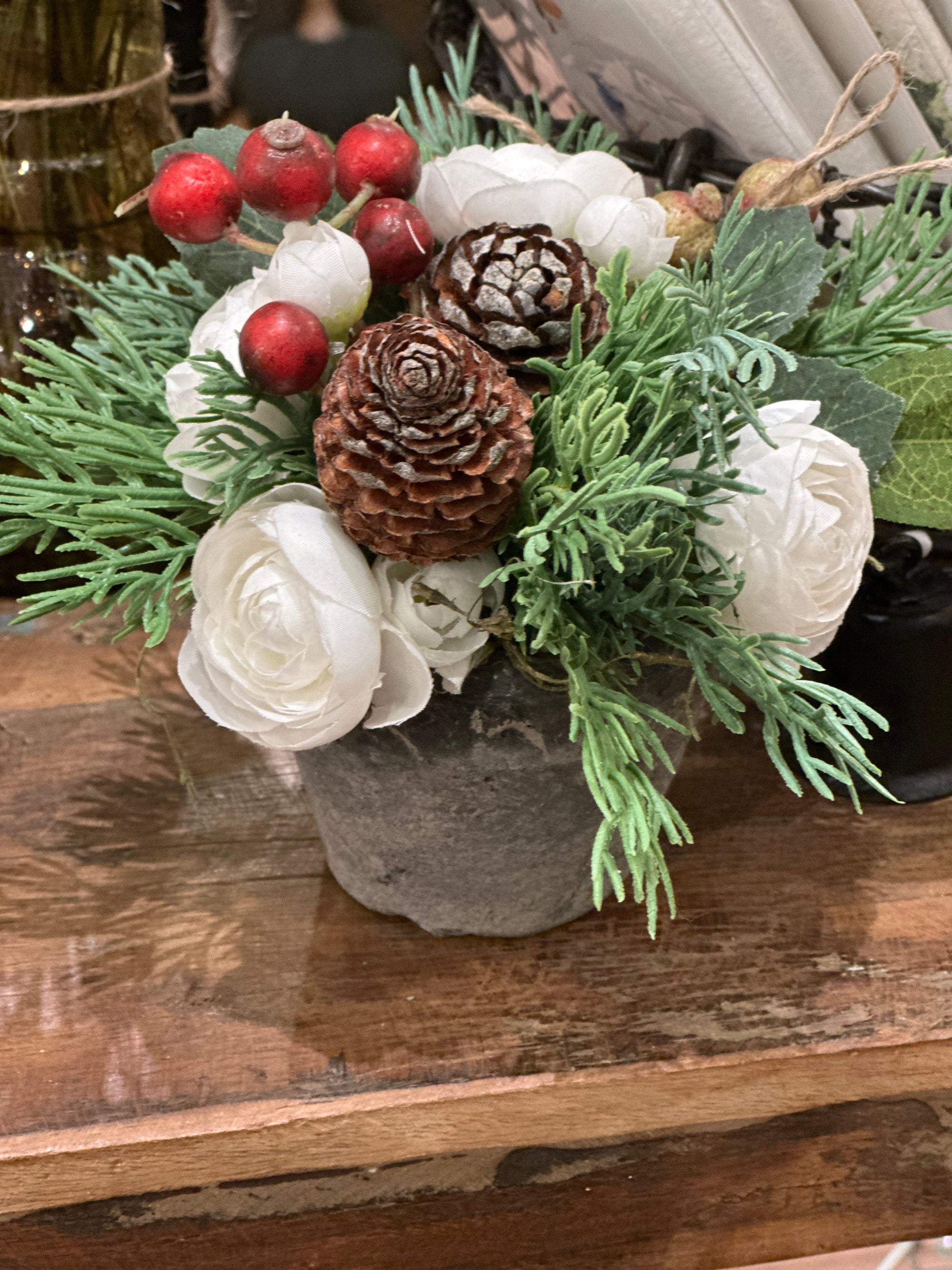 We are busy creating everlasting wreaths and arrangements. Winter greens, dried flowers, realistic faux, pinecones and seed pods. Our collection moves quickly, please visit us in store for best selection.